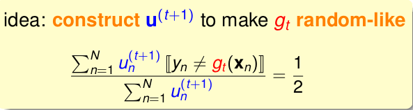 考虑在两轮中使用un(t)和un(t+1)获得的gt和gt+1。如果我们选出的gt在使用权重un(t+1)时效果越差,那么gt和与gt类似的假设就都不会被选择,这也就说明了gt+1和gt差别就会很大。那么我们从全局上考虑,如果让所有的g整体上表现最好,那么让其发生的更随机,就类似丢硬币:概率为1/2: