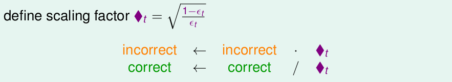 上一节中,我们讨论了optimal re-weighting,其意义是首先将手上的gt的错误率a计算出来,然后把错误的点做(1-a)比例的放缩,然后把正确的点做a的放缩。现在我们定义一个新的比例因子来代替上面的a: